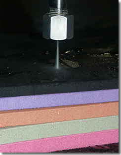 Our waterjet cutter uses the power of highly pressurized, abrasive–free water and the precision of computer programming to create products that require a high degree of detail. With a jet of water pressurized at 60,000 psi, traveling at three times the speed of sound, we are able to cut through foam products up to 4 inches thick. For perspective, the cutter is able to slice through a 1/2 inch piece of plywood on our standard foam-cutting settings with a jet only .005 inches in diameter. After a pattern is programmed, the foam sheet to be cut is placed on a bed of 7 inch corrugated plastic that diffuses the jet’s stream. The nozzle hovers over the sheet, tracing the form’s outline with the jet, cutting through the foam cleanly.